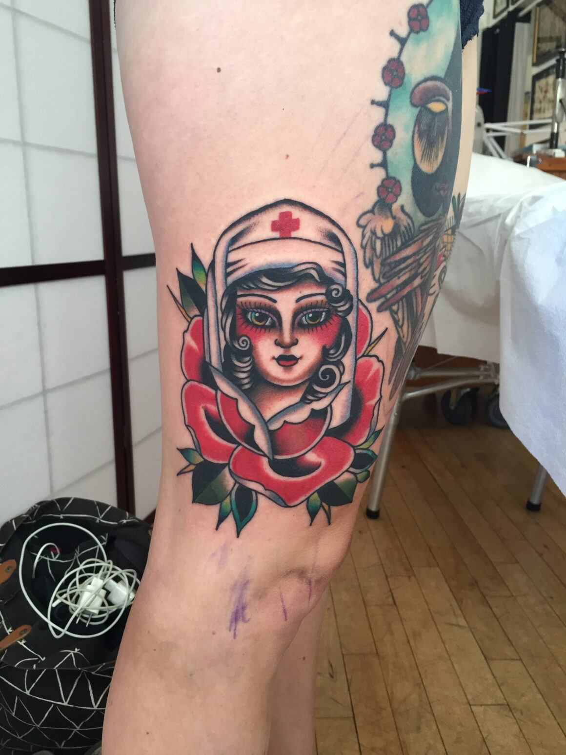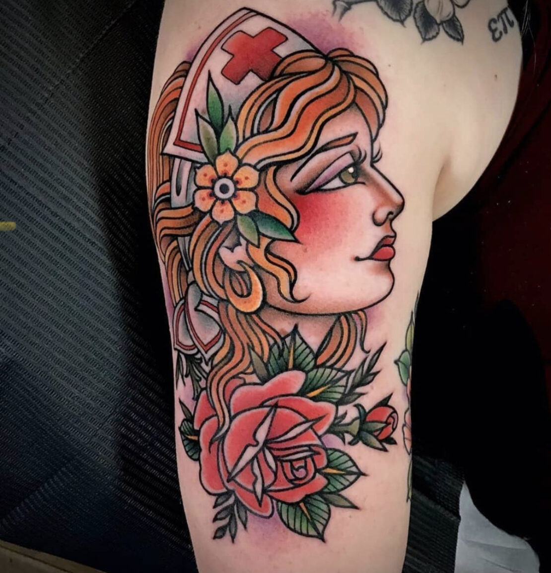 This subject is still popular in the third millennium and it is utterly unmistakeable: a woman’s face in the Traditional/Old School style with a nurse’s cap and, an essential detail, a prominent red cross in the centre of the design.