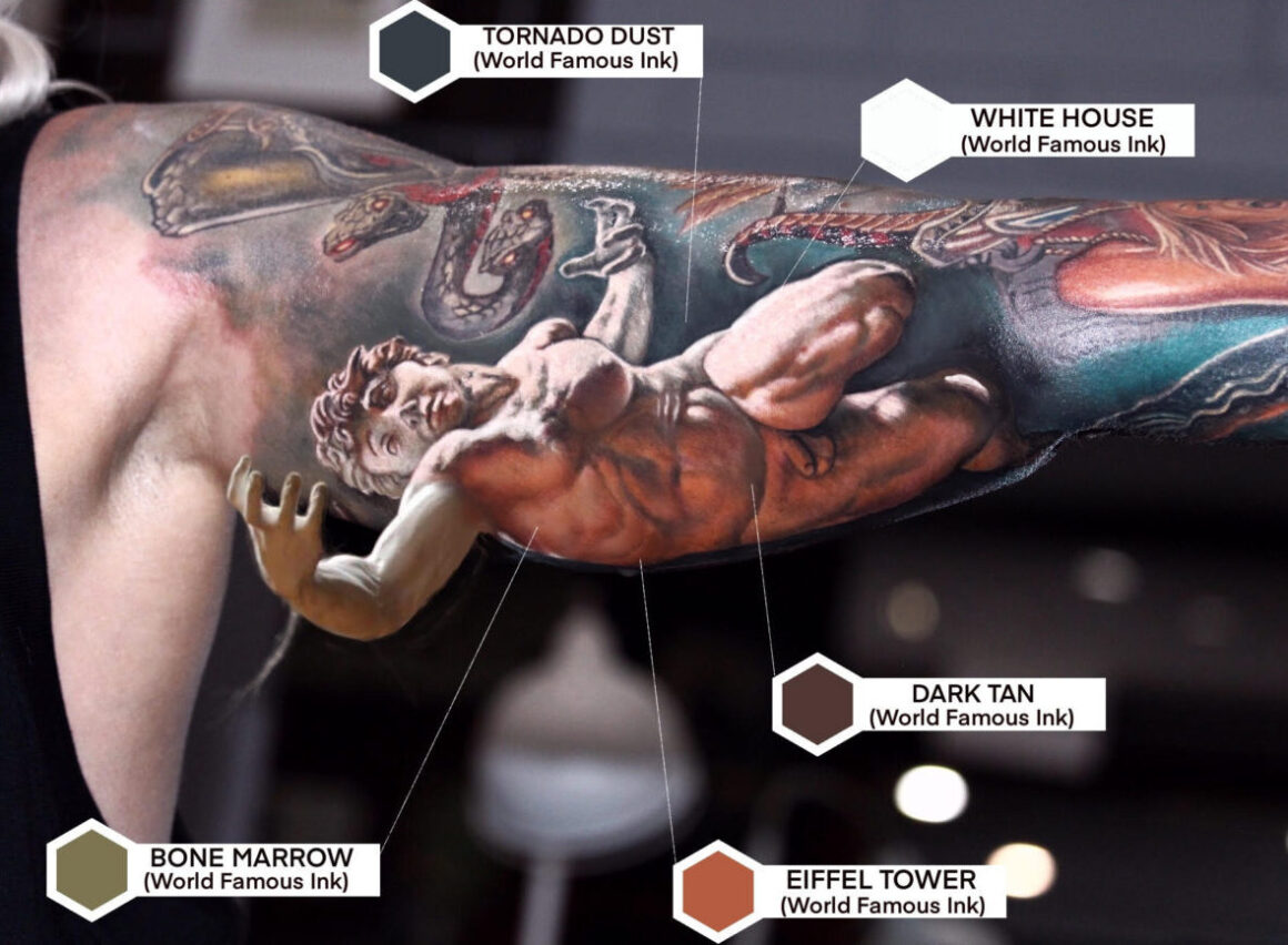 I discovered World Famous Ink at the Atlantic City Tattoo convention. I needed some white so my good friend Joey Tattoo said hey try some “White House”. It blew my mind how easy it was to use and how no blood seeped through and it seemed easy to keep clean when wiping another colour over the top of it. I had a cool piece on the Sunday of the show so I went and purchased all the colours involved for that piece and I won Best of Show.