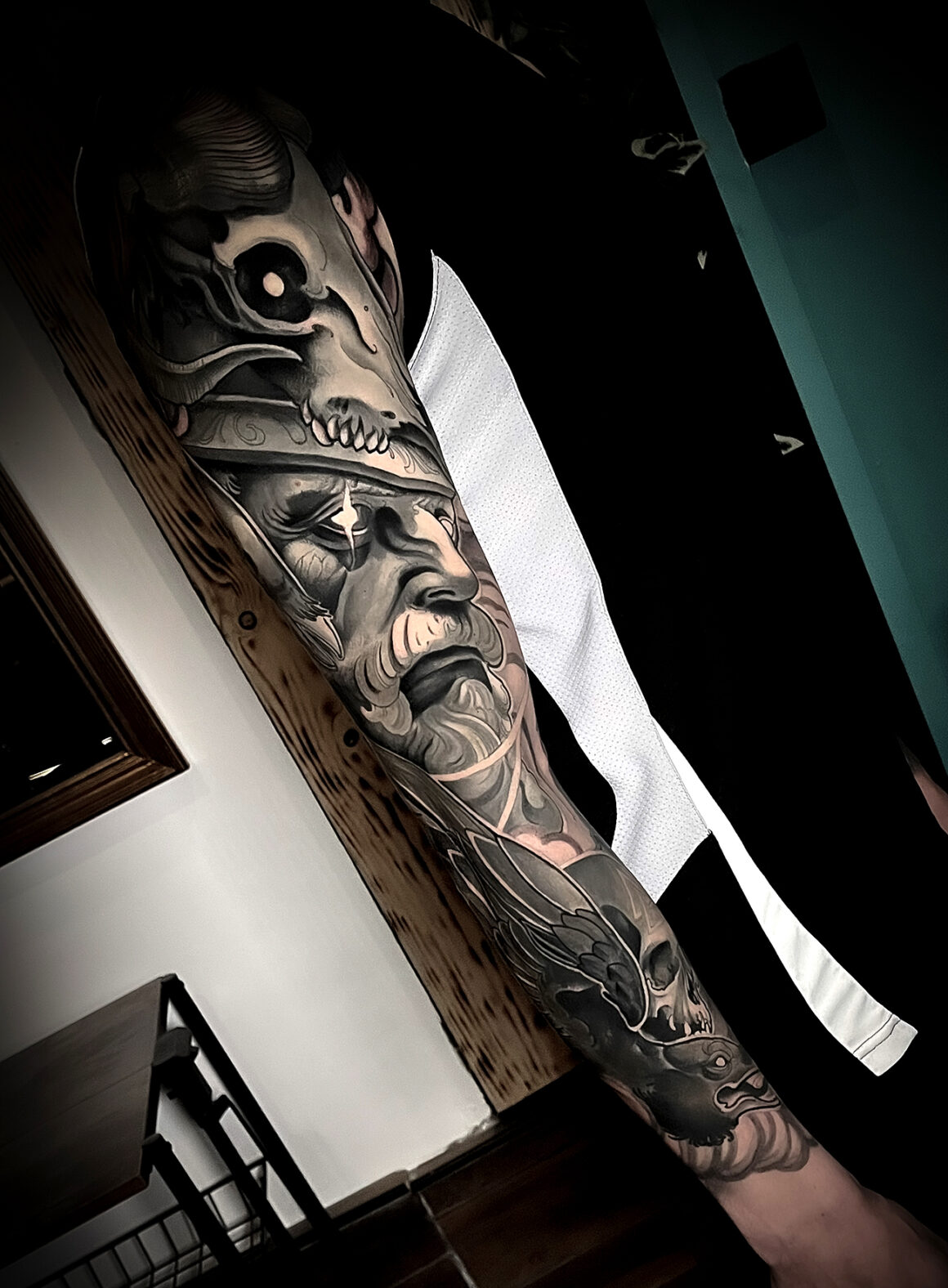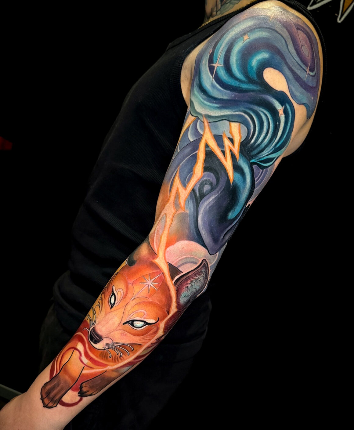 The human connection was incredible… It’s in the top 10 most memorable experiences of my life. In 2016, I saw that she was participating in the Luxembourg convention, The Storm. I thought to myself: “Okay, I’ll rent a booth, sacrifice my Friday, and get a tattoo.” She accepted my Robin Hood-themed arm tattoo design. After that first session, I went to her home in Richmond, Virginia. Once there, she invited me to stay and tattoo.