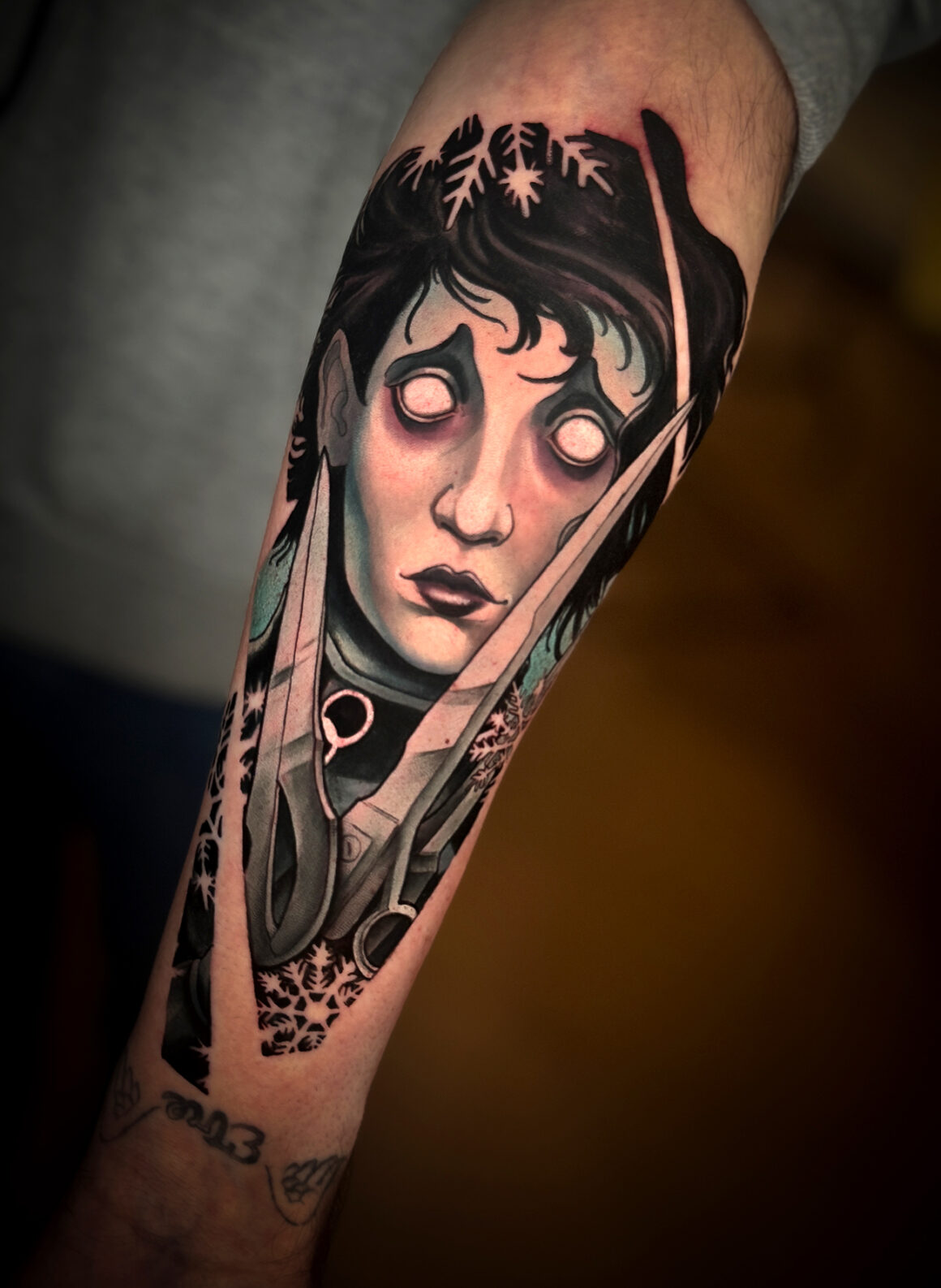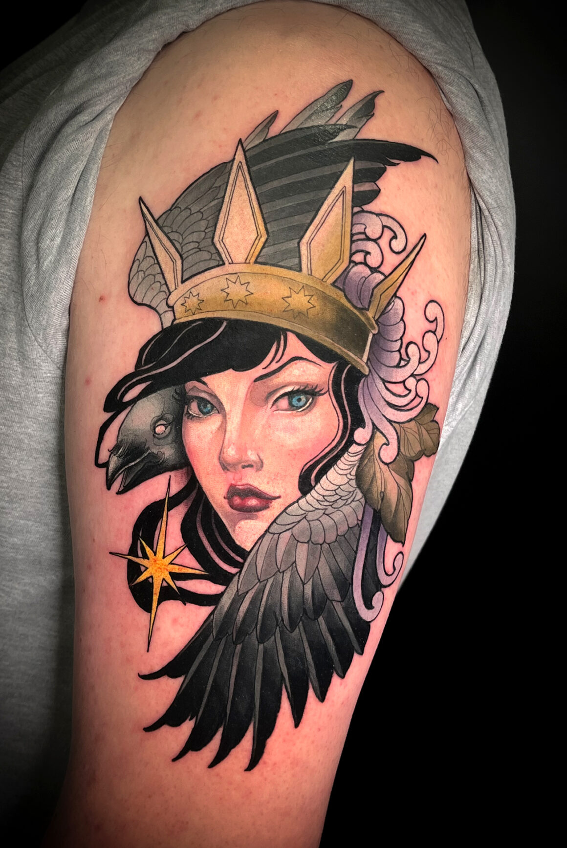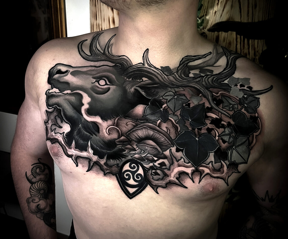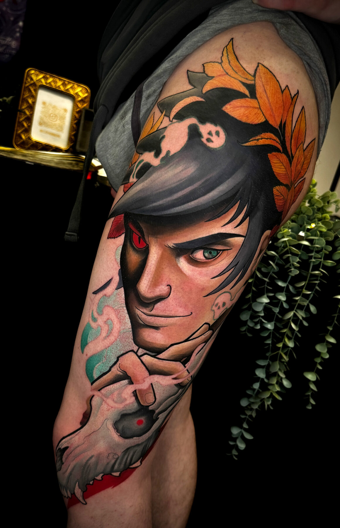 When I started tattooing, I was inevitably influenced by Dimitri and the new school style, which I loved. But very quickly, I began searching for my own path. One day, he brought a bunch of books back to the shop, and I discovered the sketchbook of Eckel, a neo-traditional artist. It was a real revelation: I was struck by the poetry of his work, this blend of raw energy and melancholy. I’ve always felt torn between my explosive, punk side and my gothic, poetic sensibility. Neo-traditional appealed to me with its autumnal colors, found it a bit less dynamic compared to new school.