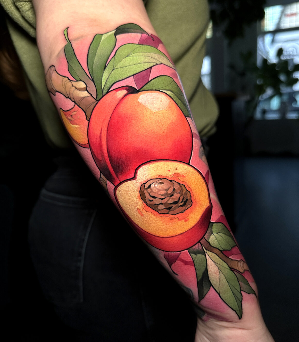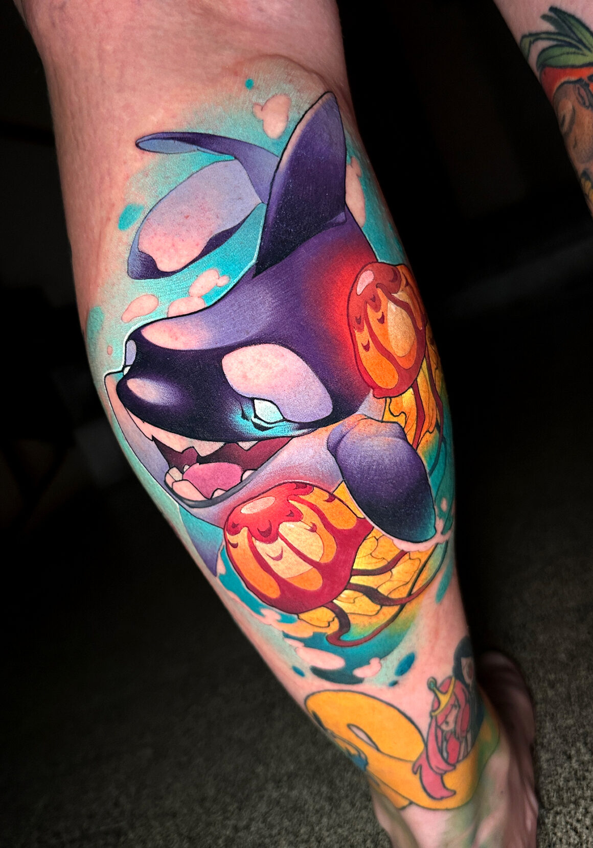He works in the Dutch studio founded by his father (the curious ‘Dogstar Tattoos’ in Aalsmeer), comes from street experiences in Graffiti, and now is ready to amaze us with his New School works with bright colors inspired by cartoons.