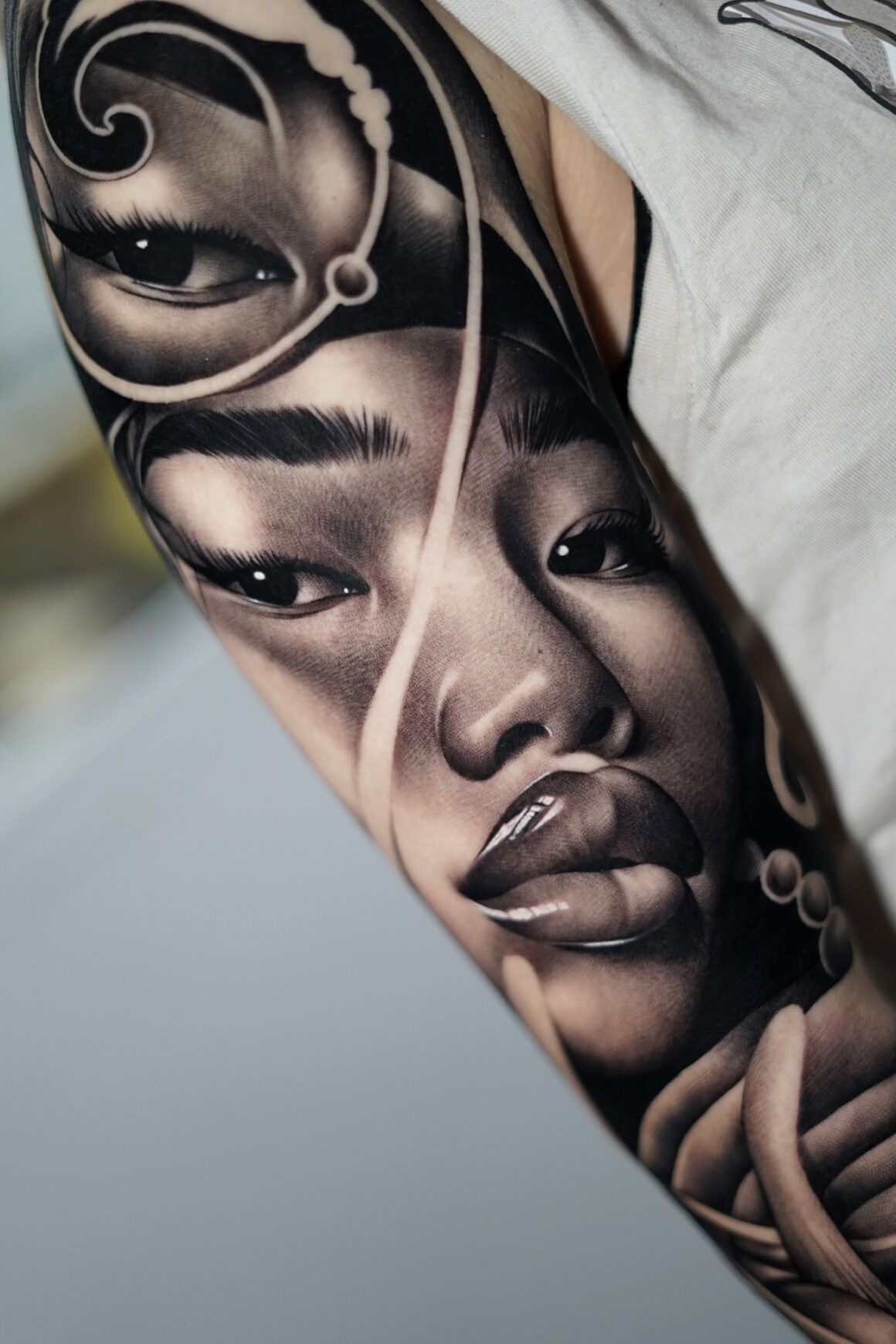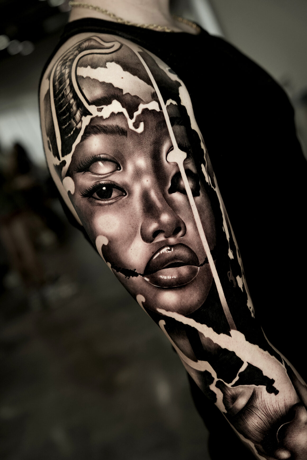 Yes. At the moment, Asian women’s faces are one of my favorite subjects to tattoo. Unlike more standard facial structures, I find their features are more subtle and nuanced, which makes capturing their expression and essence a greater challenge and that’s exactly what I enjoy about it. Each piece pushes me to be more precise and more sensitive in the way I interpret the face. And of course, I love adding a disruptive surrealistic twist to make the composition even more interesting and complex.