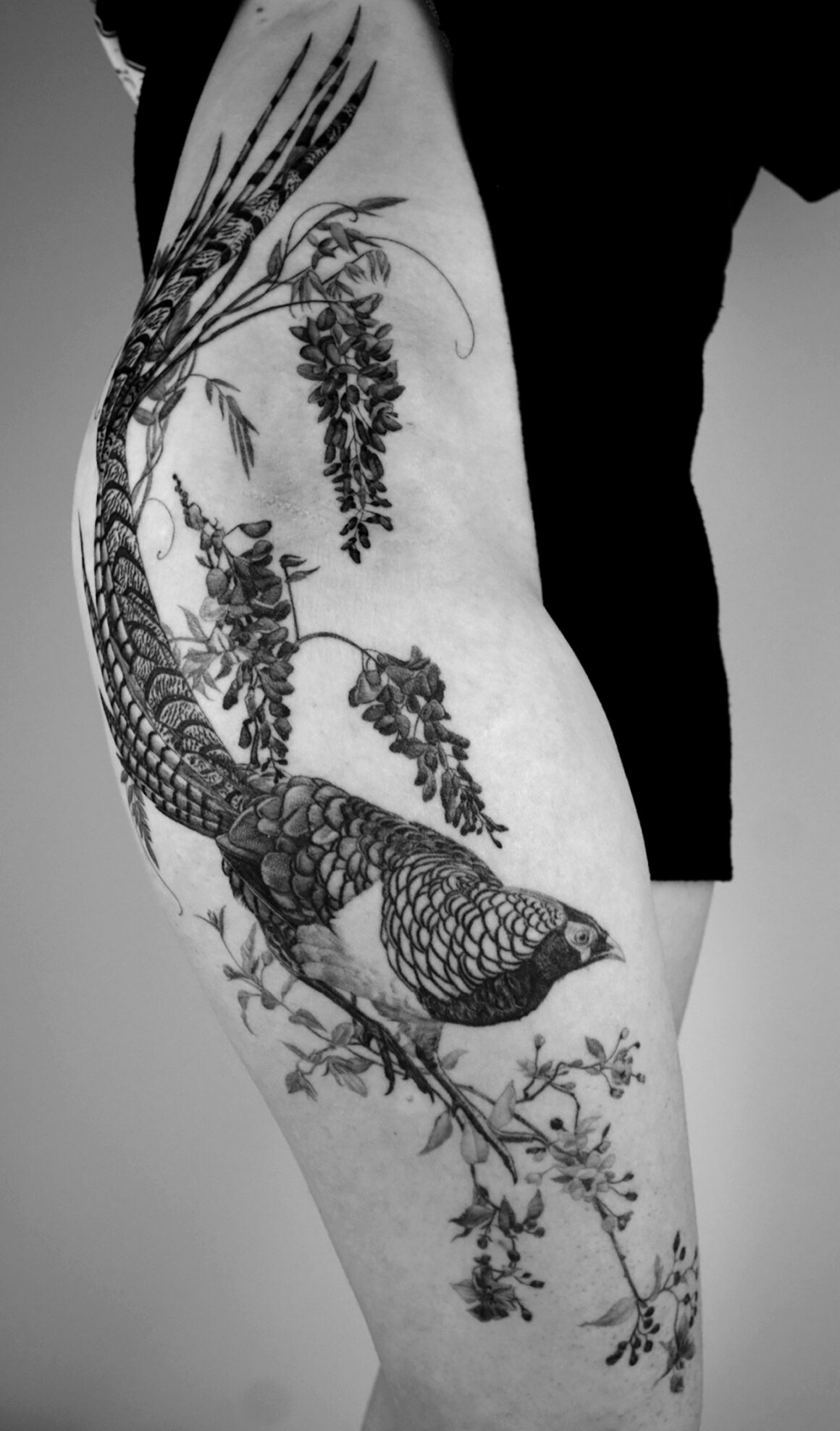 In theater, everything is about tension, gesture. It’s not just words, but also the movement of the body. I think tattooing works in a similar way. A tattoo is never just an image – it lives on a body, it moves, it breathes. I very much like to integrate a certain flow into my designs, so it works with the individual muscles and shape of the body. I want to create movement and harmony.