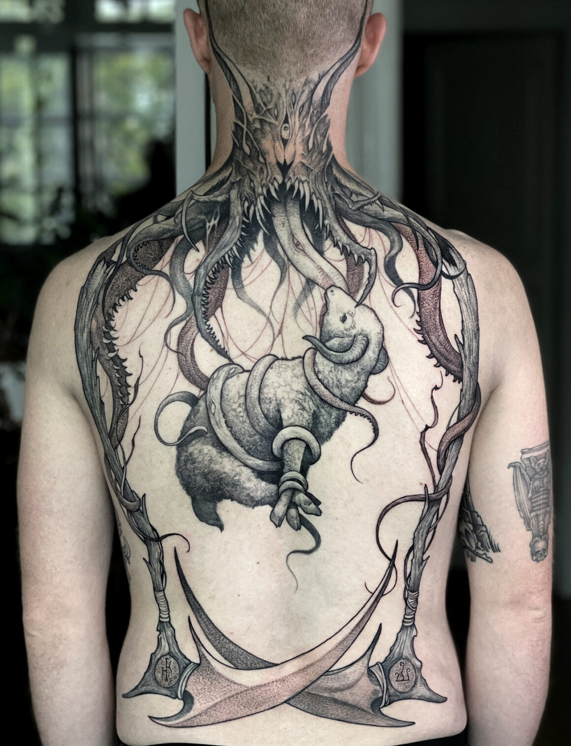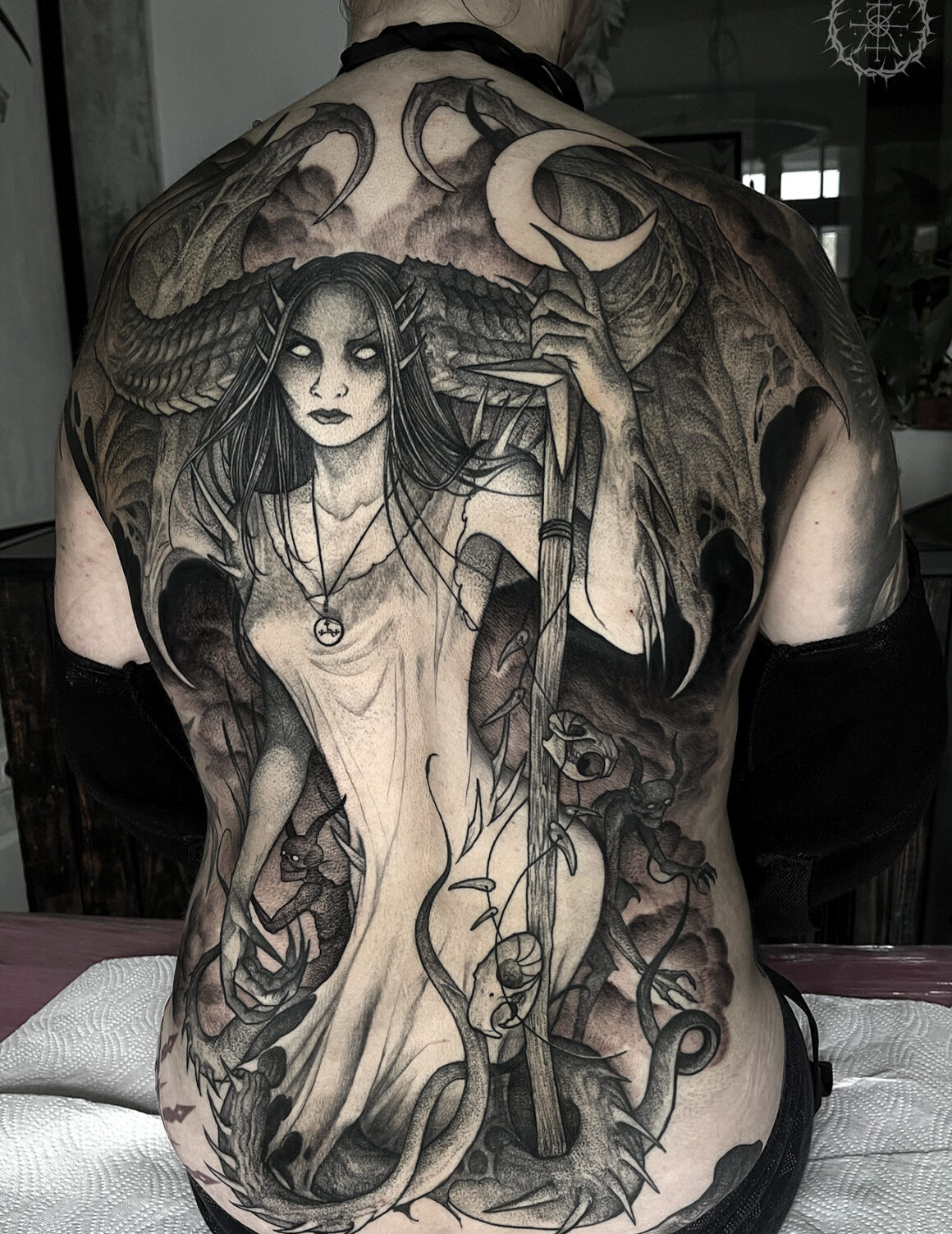 This shift in awareness has had a direct impact on his technique. Borbás has begun integrating new solutions, such as softer grey washes and more nuanced tonal variations. “Working with softer tones has helped me create tattoos that are more defined, more readable, and with far more effective contrast,” he explains. It’s a change that doesn’t dilute his dark imagery but makes it more suitable to stand the test of time, visually stable, and even more powerful in its impact.