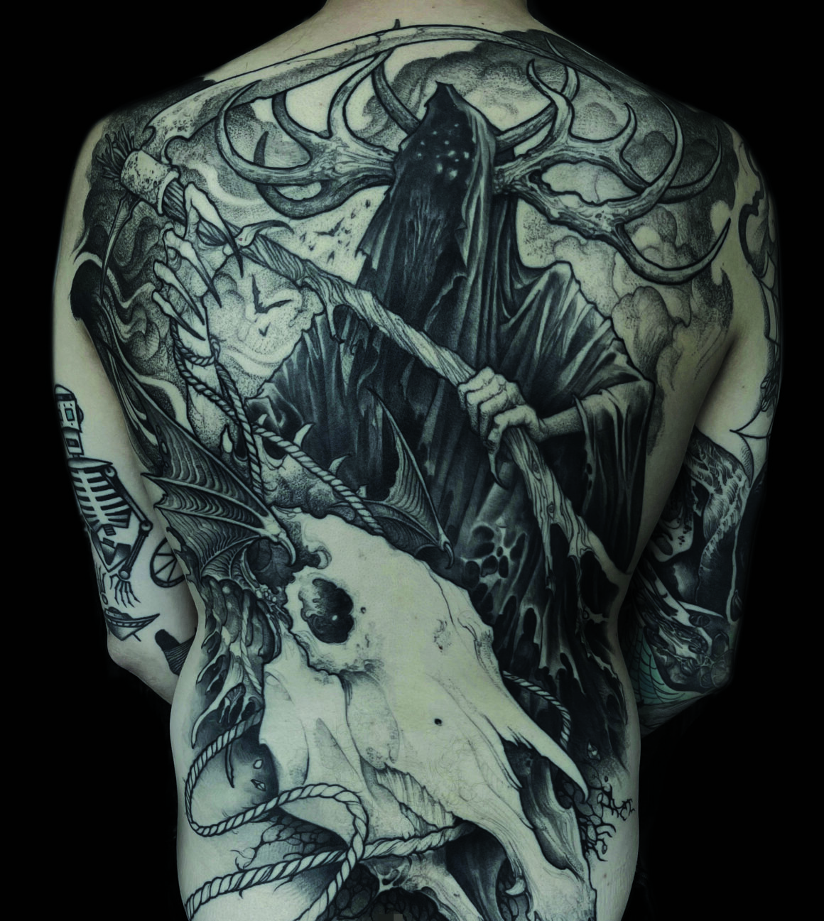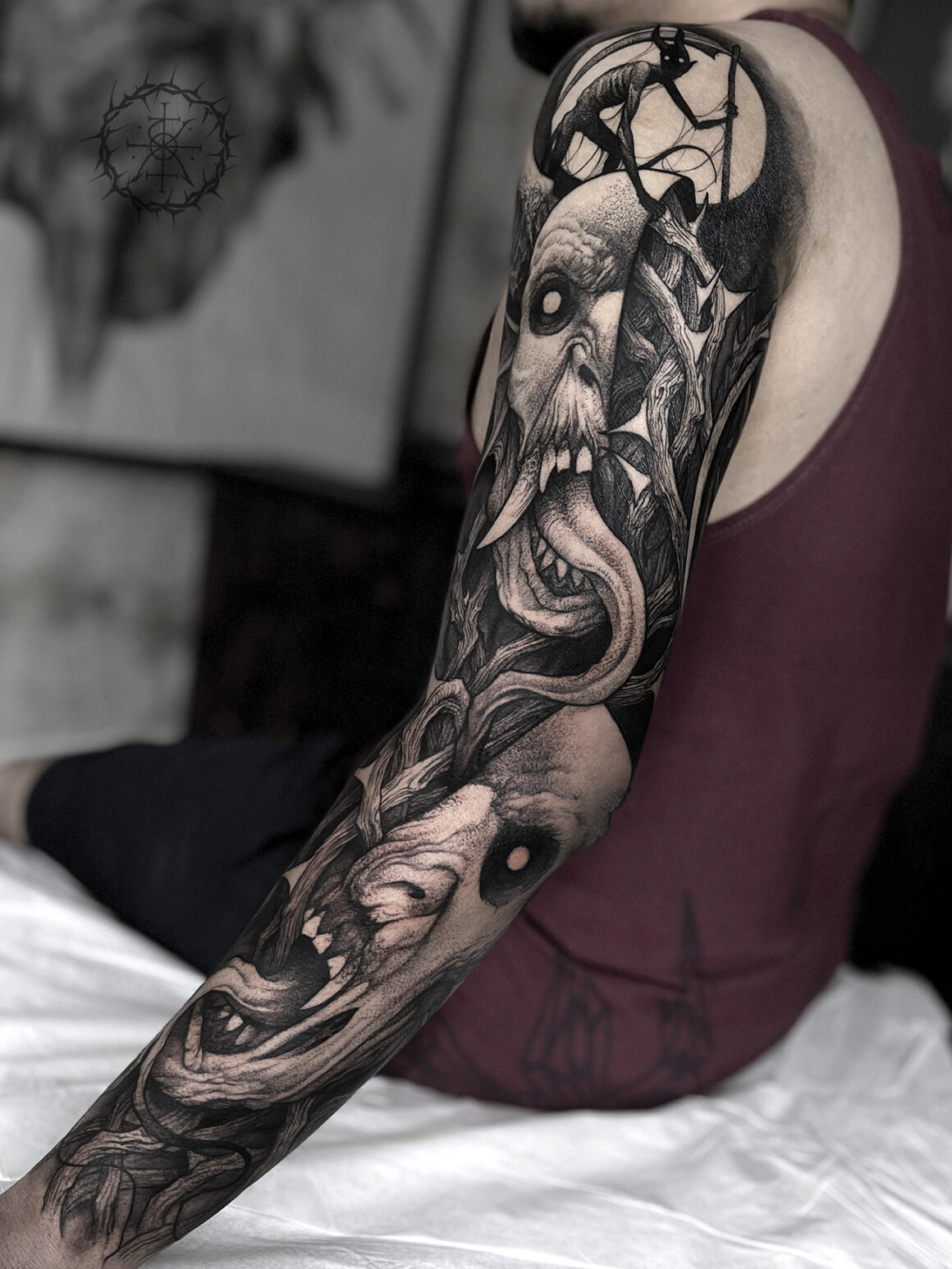 It is in this balance between darkness and technical clarity—between inner demons and the precision of tattoo craft—that the heart of Grindesign’s tattooing lies today. A language that continues to evolve without ever losing that unsettling force which has made him one of the most recognisable names on the international scene.