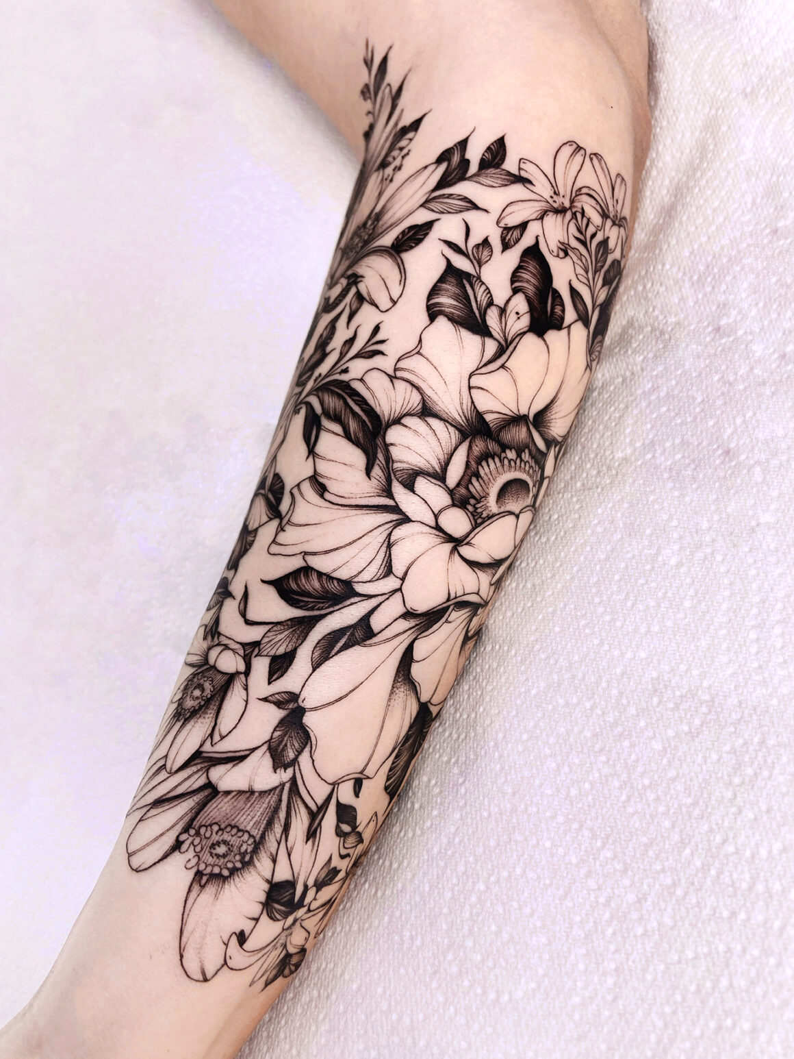 With a degree in philosophy from the University of Madrid, 10 years of piano studies, and a passion for flower photography, Madrid-born Beatriz (known on social media as @des_true) brings her floral tattoos to life. An artist with refined taste, she skillfully plays with black lines and voids and solids to create her botanical designs.