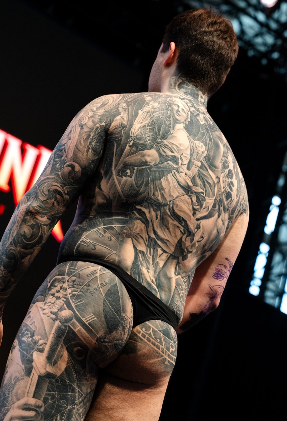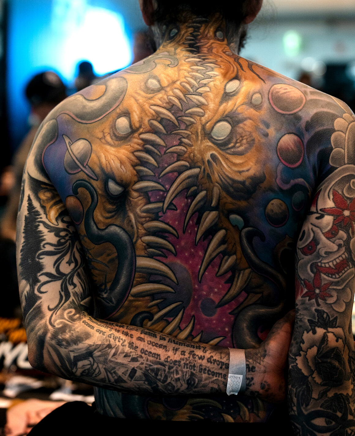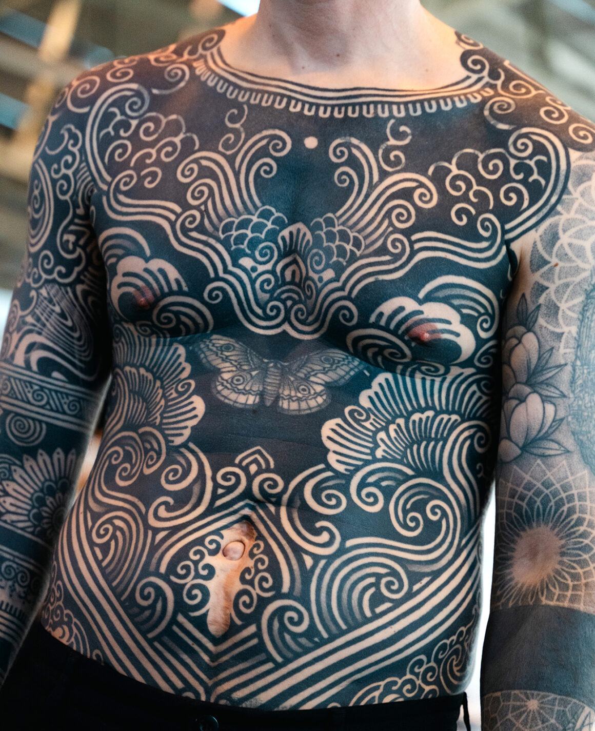From this freedom come the works that dominate Gods of Ink: bodysuits that turn the human body into perfect geometric compositions, or into windows opening onto natural landscapes; figures that transform human beings into warriors, animals, or even into universes made of planets and cosmic visions. Each work is a story, each body a complex narrative.