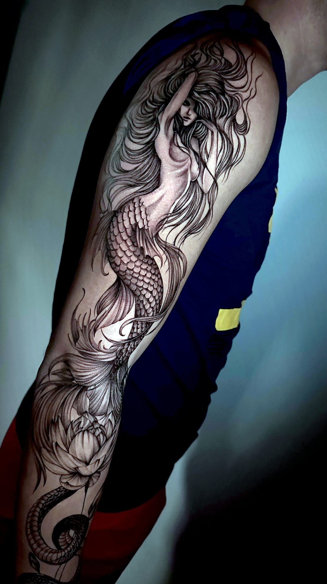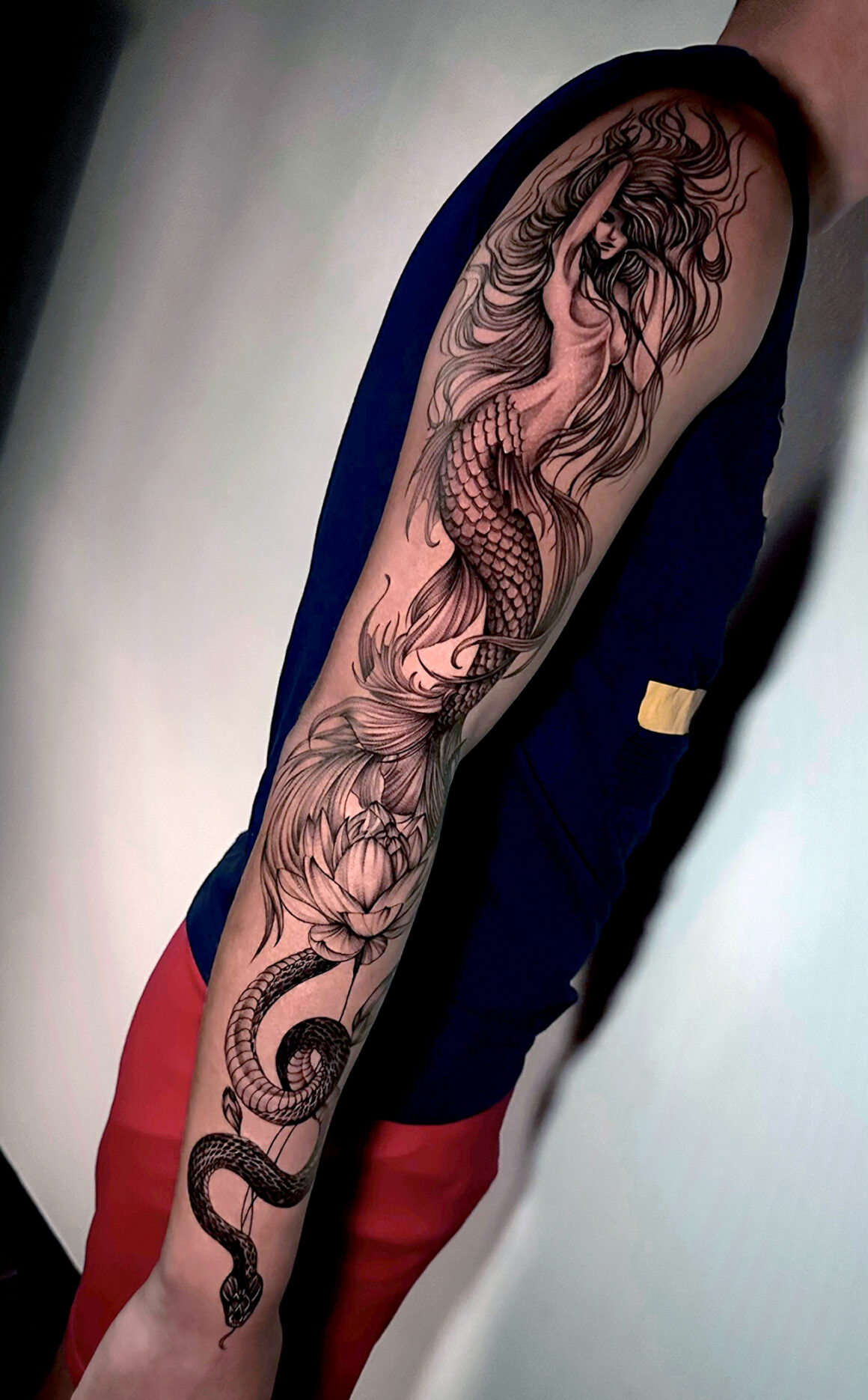 Beyond visual quality, my method offers a clear functional advantage. Because I use finer needles and apply pigment in a more controlled way, I can significantly reduce mechanical trauma to the skin during the process. In practice, this means the surrounding tissue experiences less irritation throughout the session, leading to a smoother healing phase and cleaner healed results. This is especially important in fine line and black-and-grey realism, where the integrity of healed lines and subtle tonal transitions defines how well a tattoo holds over time.